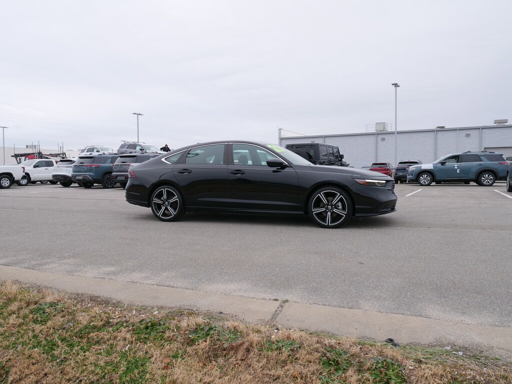 Certified. Crystal Black Pearl 2023 Honda Accord Hybrid Sport 2.0L 16V DOHC eCVT FWD HondaTrue Certified Certified, 2.0L 16V DOHC, 4-Wheel Disc Brakes, 8 Speakers, ABS brakes, Adaptive Cruise Control: Adaptive Cruise Control (ACC) with Low-Speed Follow, Air Conditioning, Alloy wheels, AM/FM radio, Apple CarPlay/Android Auto, Auto High-beam Headlights, Automatic temperature control, Blind Spot Information (BSI) System warning, Brake assist, Bumpers: body-color, Compass, Delay-off headlights, Driver door bin, Driver vanity mirror, Dual front impact airbags, Dual front side impact airbags, Electronic Stability Control, Emergency communication system: HondaLink, Exterior Parking Camera Rear, Fabric Seat Trim, Four wheel independent suspension, Front anti-roll bar, Front Bucket Seats, Front Center Armrest, Front dual zone A/C, Front reading lights, Fully automatic headlights, Illuminated entry, Knee airbag, Lane departure: Lane Keeping Assist System (LKAS) active, Leather Shift Knob, Leather steering wheel, Low tire pressure warning, Occupant sensing airbag, Outside temperature display, Overhead airbag, Overhead console, Panic alarm, Passenger door bin, Passenger vanity mirror, Power door mirrors, Power driver seat, Power moonroof, Power steering, Power windows, Radio data system, Radio: 180-Watt Audio System, Rear anti-roll bar, Rear reading lights, Rear seat center armrest, Rear side impact airbag, Rear window defroster, Remote keyless entry, Security system, Speed control, Speed-sensing steering, Speed-Sensitive Wipers, Split folding rear seat, Spoiler, Steering wheel mounted audio controls, Telescoping steering wheel, Tilt steering wheel, Traction control, Trip computer, Variably intermittent wipers, and Wheels: 19 x 8.5J Berlina Black.