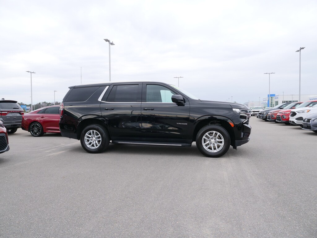 Black 2021 Chevrolet Tahoe LT RWD 10-Speed Automatic with Overdrive EcoTec3 5.3L V8 Preferred Equipment Group 1LT (1st & 2nd Row Color-Keyed Carpeted Floor Mats, 2 USB Data Ports, Auto-Dimming Inside Rear-View Mirror, Bright Front & Rear Door Sill Plates, Color-Keyed Carpeting Floor Covering, Driver & Front Outboard Passenger Airbags, Floor Console w/Storage Area, Hands-Free Rear Power Programmable Liftgate, HD Radio, Infotainment Display, Leather-Wrapped Steering Wheel, LED Daytime Running Lamps, Memory Settings for Driver, Remote Start, SiriusXM Radio w/360L, and Universal Home Remote), Black Leather, 10-Way Power Driver & Passenger Seat Adjusters, 3.23 Rear Axle Ratio, 3rd row seats: split-bench, 4-Wheel Disc Brakes, 9 Speakers, ABS brakes, Air Conditioning, Alloy wheels, AM/FM radio: SiriusXM with 360L, Apple CarPlay/Android Auto, Auto High-beam Headlights, Auto-dimming Rear-View mirror, Automatic temperature control, Bose 9-Speaker Stereo Audio System Feature, Brake assist, Bumpers: body-color, Compass, Delay-off headlights, Driver door bin, Driver vanity mirror, Dual front impact airbags, Dual front side impact airbags, Electronic Stability Control, Emergency communication system: OnStar and Chevrolet connected services capable, Four wheel independent suspension, Front anti-roll bar, Front Bucket Seats, Front Center Armrest, Front dual zone A/C, Front High-Back Reclining Bucket Seats, Front reading lights, Fully automatic headlights, Garage door transmitter, Heated door mirrors, Heated Driver & Front Passenger Seats, Heated front seats, Illuminated entry, Leather Seat Trim, Leather steering wheel, Low tire pressure warning, Memory seat, Occupant sensing airbag, Outside temperature display, Overhead airbag, Overhead console, Panic alarm, Passenger door bin, Passenger vanity mirror, Power door mirrors, Power driver seat, Power Liftgate, Power passenger seat, Power steering, Power windows, Premium audio system: Chevrolet Infotainment 3, Premium Smooth Ride Suspension, Radio: Chevrolet Infotainment 3 Plus System, Rain sensing wipers, Rear air conditioning, Rear anti-roll bar, Rear reading lights, Rear seat center armrest, Rear window defroster, Rear window wiper, Remote keyless entry, Roof rack: rails only, Security system, Speed control, Speed-sensing steering, Split folding rear seat, Spoiler, Steering wheel mounted audio controls, Tachometer, Telescoping steering wheel, Tilt steering wheel, Traction control, Trip computer, Variably intermittent wipers, Voltmeter, and Wheels: 18" x 8.5" Bright Silver Painted Aluminum.