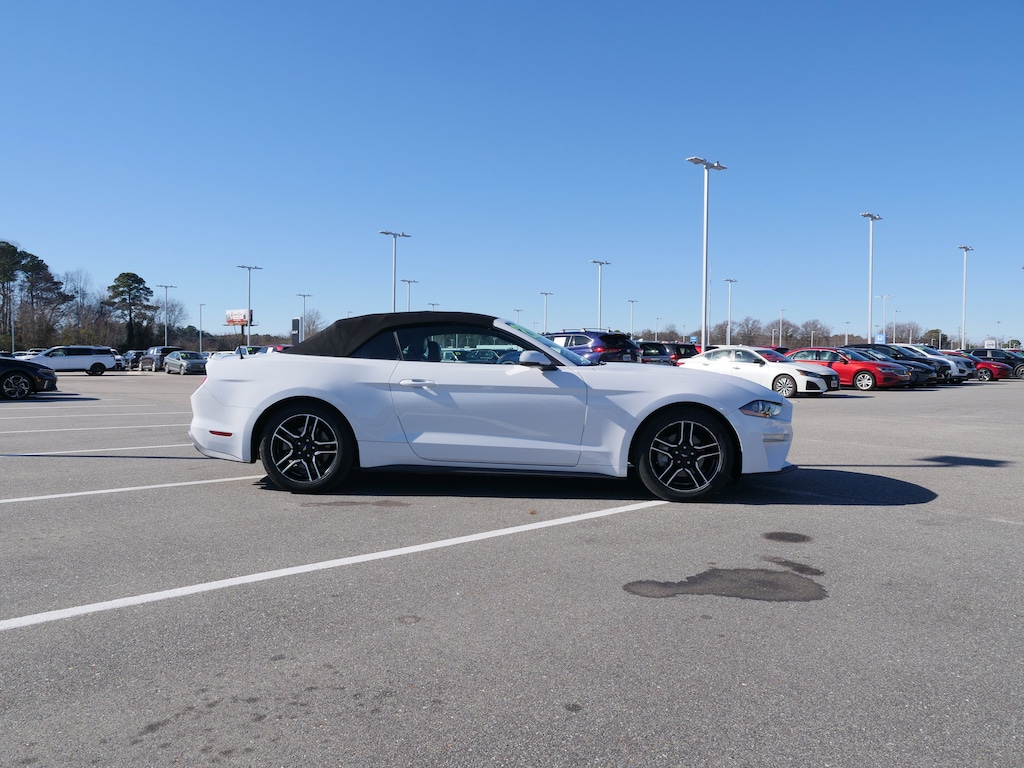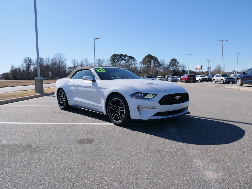 Oxford White 2020 Ford Mustang EcoBoost Premium RWD 10-Speed Automatic 2.3L I4 Turbocharged EcoBoost 4-Wheel Disc Brakes, ABS brakes, Air Conditioning, Alloy wheels, AM/FM Stereo, Auto-dimming Rear-View mirror, Brake assist, Bumpers: body-color, Compass, Convertible roof lining, Delay-off headlights, Driver door bin, Driver vanity mirror, Dual front impact airbags, Dual front side impact airbags, Electronic Stability Control, Emergency communication system: 911 Assist, Exterior Parking Camera Rear, Four wheel independent suspension, Front anti-roll bar, Front Bucket Seats, Front Center Armrest, Front reading lights, Fully automatic headlights, Glass rear window, Illuminated entry, Knee airbag, Leather Shift Knob, Low tire pressure warning, Occupant sensing airbag, Outside temperature display, Overhead console, Panic alarm, Passenger door bin, Passenger vanity mirror, Power convertible roof, Power door mirrors, Power steering, Power windows, Radio data system, Rear anti-roll bar, Rear window defroster, Remote keyless entry, Security system, SiriusXM Radio, Speed control, Speed-sensing steering, Speed-Sensitive Wipers, Steering wheel mounted audio controls, SYNC 3 Communications & Entertainment System, Tachometer, Telescoping steering wheel, Tilt steering wheel, Traction control, Trip computer, Variably intermittent wipers, Voltmeter, and Wheels: 18" x 8" Machined-Face Aluminum.
