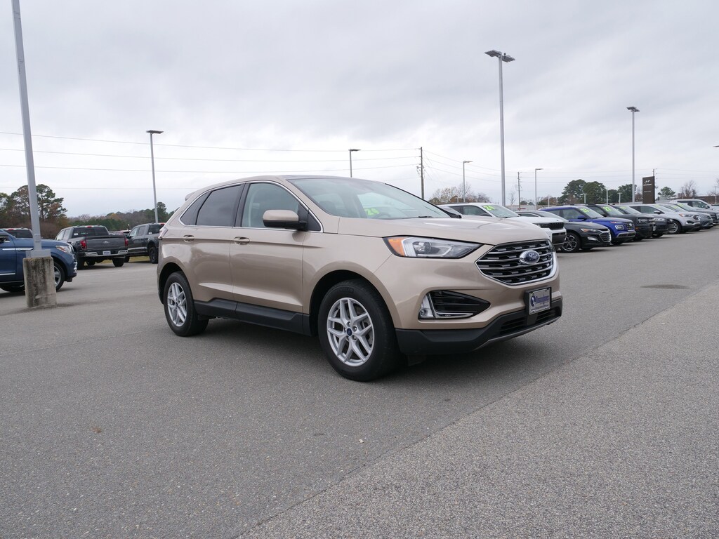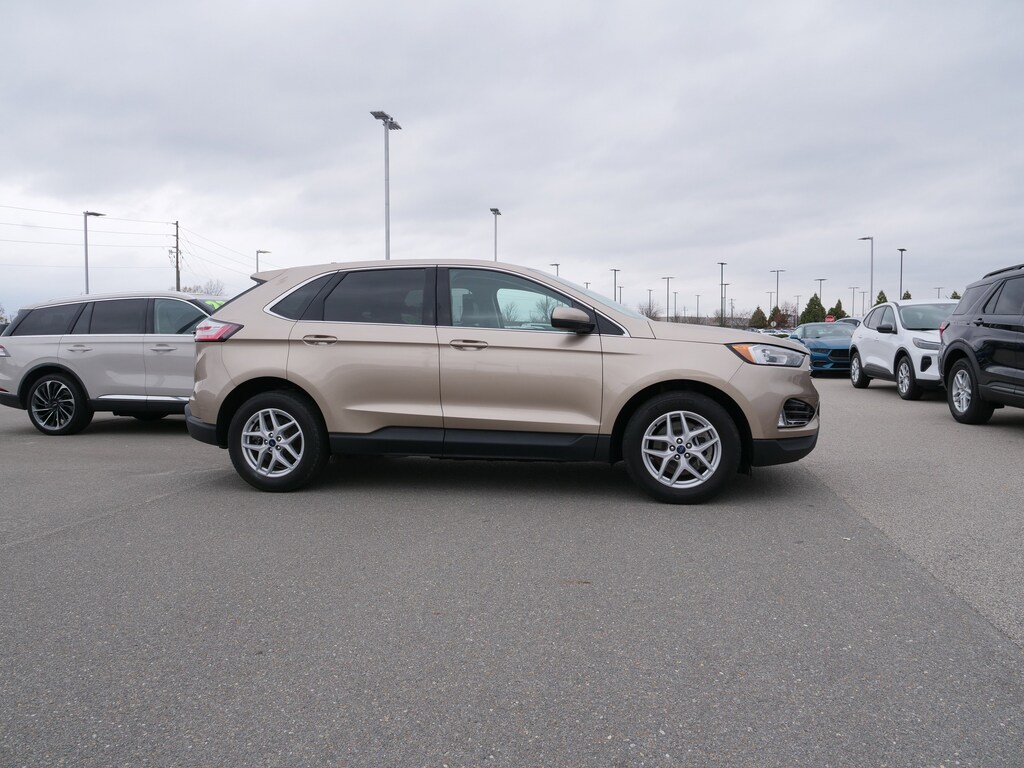 Desert Gold Metallic 2021 Ford Edge SEL AWD EcoBoost 2.0L I4 GTDi DOHC Turbocharged VCT 8-Speed Automatic Ford Co-Pilot360 Assist+ (Adaptive Cruise Control w/Stop & Go, Connected Built-In Navigation, Evasive Steering Assist, and Lane Centering), AWD, 3.80 Axle Ratio, 4-Wheel Disc Brakes, 6 Speakers, ABS brakes, ActiveX Seating Material Heated Bucket Seats, Air Conditioning, Alloy wheels, AM/FM radio: SiriusXM with 360L, Auto High-beam Headlights, Auto-dimming Rear-View mirror, Automatic temperature control, Brake assist, Bumpers: body-color, Compass, Delay-off headlights, Driver door bin, Driver vanity mirror, Dual front impact airbags, Dual front side impact airbags, Electronic Stability Control, Emergency communication system: SYNC 4 911 Assist, FordPass Connect, Four wheel independent suspension, Front & Rear Floor Liners w/Carpet Mats, Front anti-roll bar, Front Bucket Seats, Front Center Armrest w/Storage, Front dual zone A/C, Front fog lights, Front reading lights, Fully automatic headlights, Heated door mirrors, Heated front seats, Illuminated entry, Knee airbag, Low tire pressure warning, Occupant sensing airbag, Outside temperature display, Overhead airbag, Overhead console, Panic alarm, Panoramic Vista Roof, Passenger door bin, Passenger vanity mirror, Power door mirrors, Power driver seat, Power Liftgate, Power passenger seat, Power steering, Power windows, Radio: AM/FM Stereo/MP3 Capable, Rear anti-roll bar, Rear reading lights, Rear seat center armrest, Rear window defroster, Rear window wiper, Remote keyless entry, SiriusXM w/360L, Speed control, Speed-Sensitive Wipers, Split folding rear seat, Spoiler, Steering wheel mounted audio controls, SYNC 4A w/Enhanced Voice Recognition, Tachometer, Telescoping steering wheel, Tilt steering wheel, Traction control, Trip computer, and Variably intermittent wipers.
