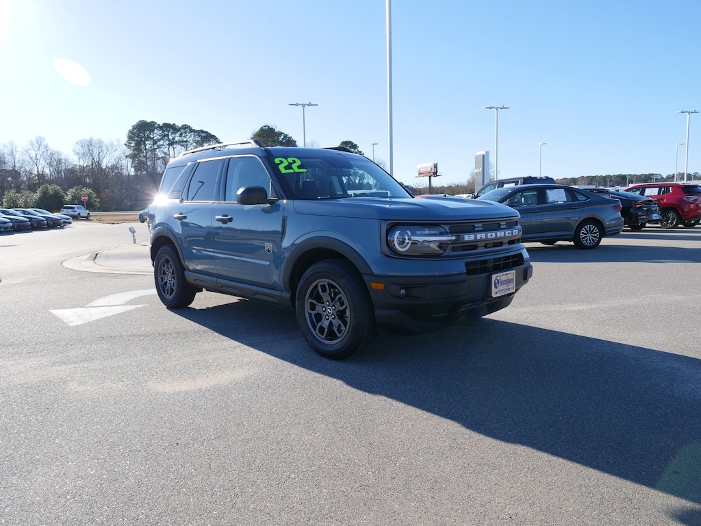 Blue Metallic 2022 Ford Bronco Sport Big Bend 4WD 8-Speed Automatic 1.5L EcoBoost Class II Trailer Tow Package w/Trailer Sway Control, Convenience Package (Front Driver & Passenger Seatback Zipper Pockets, Heated Front Bucket Seats, Intelligent Access (Lock/Unlock), Leather-Wrapped Steering Wheel, LED Fog Lamps, Rear Parking Sensors, Universal Garage Door Opener (UGDO), and Wireless Charging Pad), Equipment Group 200A, 3.80 Axle Ratio, 4-Wheel Disc Brakes, 6 Speakers, ABS brakes, Air Conditioning, Alloy wheels, AM/FM radio: SiriusXM, AM/FM Stereo, Auto High-beam Headlights, Automatic temperature control, Brake assist, Compass, Delay-off headlights, Driver door bin, Driver vanity mirror, Dual front impact airbags, Dual front side impact airbags, Electronic Stability Control, Emergency communication system: SYNC 3 911 Assist, Four wheel independent suspension, Front anti-roll bar, Front Bucket Seats, Front Center Armrest, Front reading lights, Fully automatic headlights, Heated door mirrors, Illuminated entry, Knee airbag, Low tire pressure warning, Occupant sensing airbag, Outside temperature display, Overhead airbag, Overhead console, Panic alarm, Passenger door bin, Passenger vanity mirror, Power door mirrors, Power steering, Power windows, Radio data system, Rear anti-roll bar, Rear reading lights, Rear seat center armrest, Rear window defroster, Rear window wiper, Remote keyless entry, Roof rack: rails only, Rubberized Second Row Seat Backs, Security system, SiriusXM Radio, Speed control, Speed-sensing steering, Speed-Sensitive Wipers, Split folding rear seat, Steering wheel mounted audio controls, SYNC 3 Communications & Entertainment System, SYNC 3/Apple CarPlay/Android Auto, Tachometer, Telescoping steering wheel, Tilt steering wheel, Traction control, Trip computer, Unique Cloth Front Bucket Seats, Variably intermittent wipers, and Wheels: 17" Carbonized Gray-Painted Aluminum.