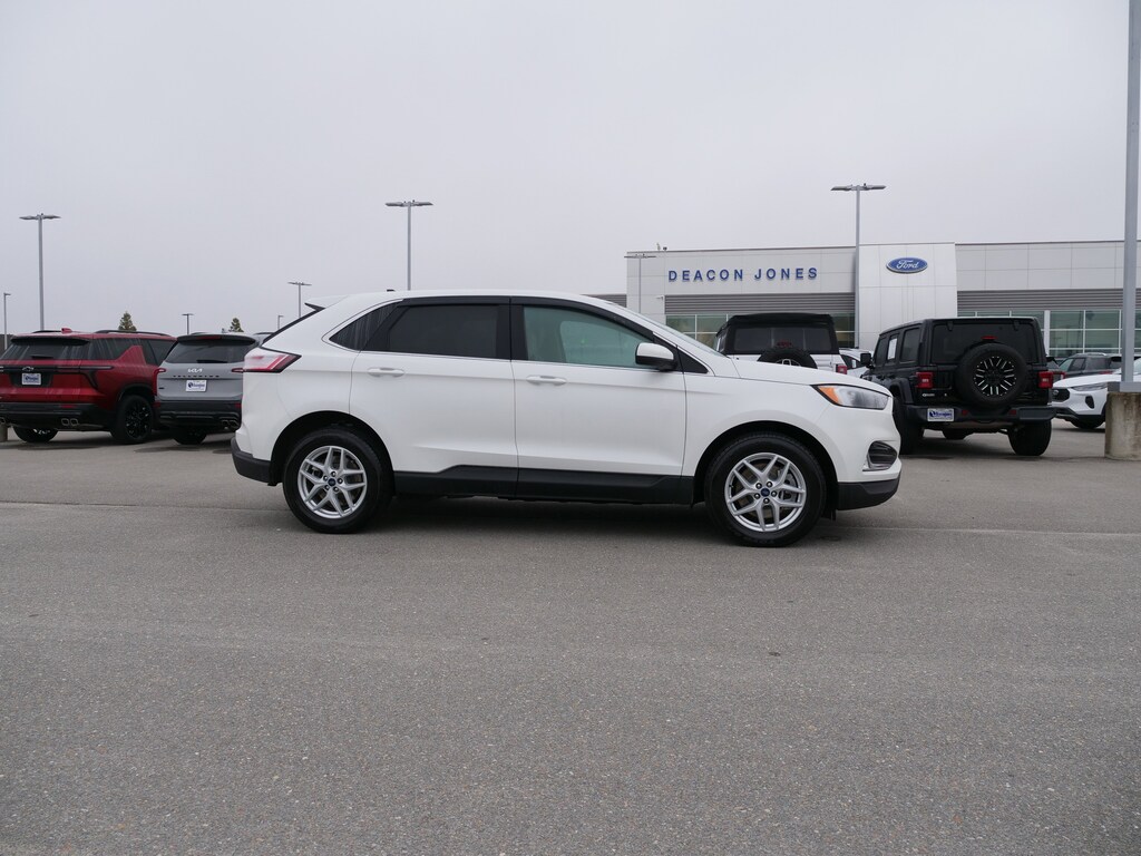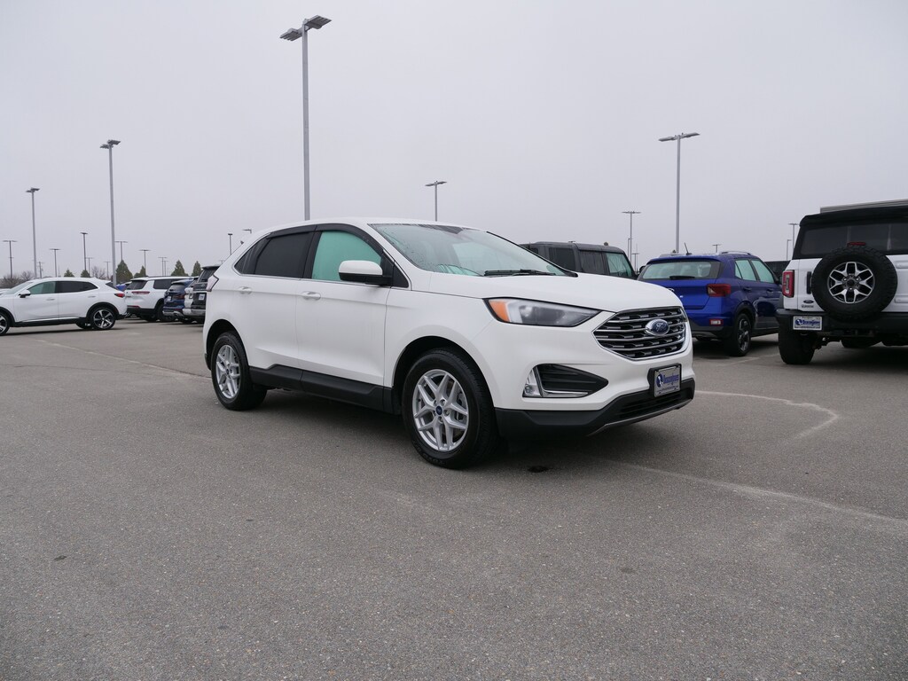 Star White Metallic Tri-Coat 2022 Ford Edge SEL AWD EcoBoost 2.0L I4 GTDi DOHC Turbocharged VCT 8-Speed Automatic Convenience Package (110V/150W AC Power Outlet, Fog Lamps w/Chrome Bezel, Perimeter Alarm, Power Liftgate, Remote Start System, SecuriCode Keyless Entry Keypad, Universal Garage Door Opener (UGDO), and Wireless Charging Pad), Equipment Group 201A, AWD, 3.80 Axle Ratio, 4-Wheel Disc Brakes, 6 Speakers, ABS brakes, ActiveX Seating Material Heated Bucket Seats, Air Conditioning, Alloy wheels, AM/FM radio: SiriusXM with 360L, Auto High-beam Headlights, Auto-dimming Rear-View mirror, Automatic temperature control, Brake assist, Bumpers: body-color, Compass, Delay-off headlights, Driver door bin, Driver vanity mirror, Dual front impact airbags, Dual front side impact airbags, Electronic Stability Control, Emergency communication system: SYNC 4 911 Assist, FordPass Connect, Four wheel independent suspension, Front anti-roll bar, Front Bucket Seats, Front Center Armrest w/Storage, Front dual zone A/C, Front reading lights, Fully automatic headlights, Heated door mirrors, Heated front seats, Illuminated entry, Knee airbag, Low tire pressure warning, Occupant sensing airbag, Outside temperature display, Overhead airbag, Overhead console, Panic alarm, Passenger door bin, Passenger vanity mirror, Power door mirrors, Power driver seat, Power passenger seat, Power steering, Power windows, Radio: AM/FM Stereo/MP3 Capable, Rear anti-roll bar, Rear Parking Sensors, Rear reading lights, Rear seat center armrest, Rear window defroster, Rear window wiper, Remote keyless entry, SiriusXM w/360L, Speed control, Speed-Sensitive Wipers, Split folding rear seat, Spoiler, Steering wheel mounted audio controls, SYNC 4A w/Enhanced Voice Recognition, Tachometer, Telescoping steering wheel, Tilt steering wheel, Traction control, Trip computer, Variably intermittent wipers, and Wheels: 18 Sparkle Silver-Painted Aluminum.