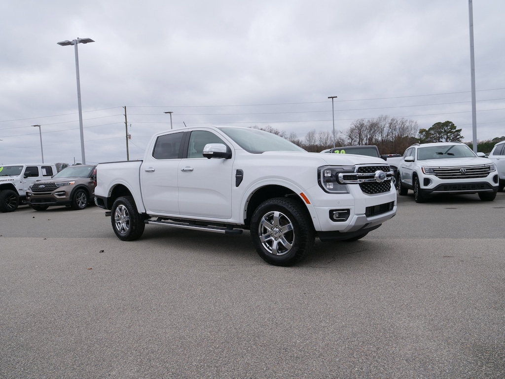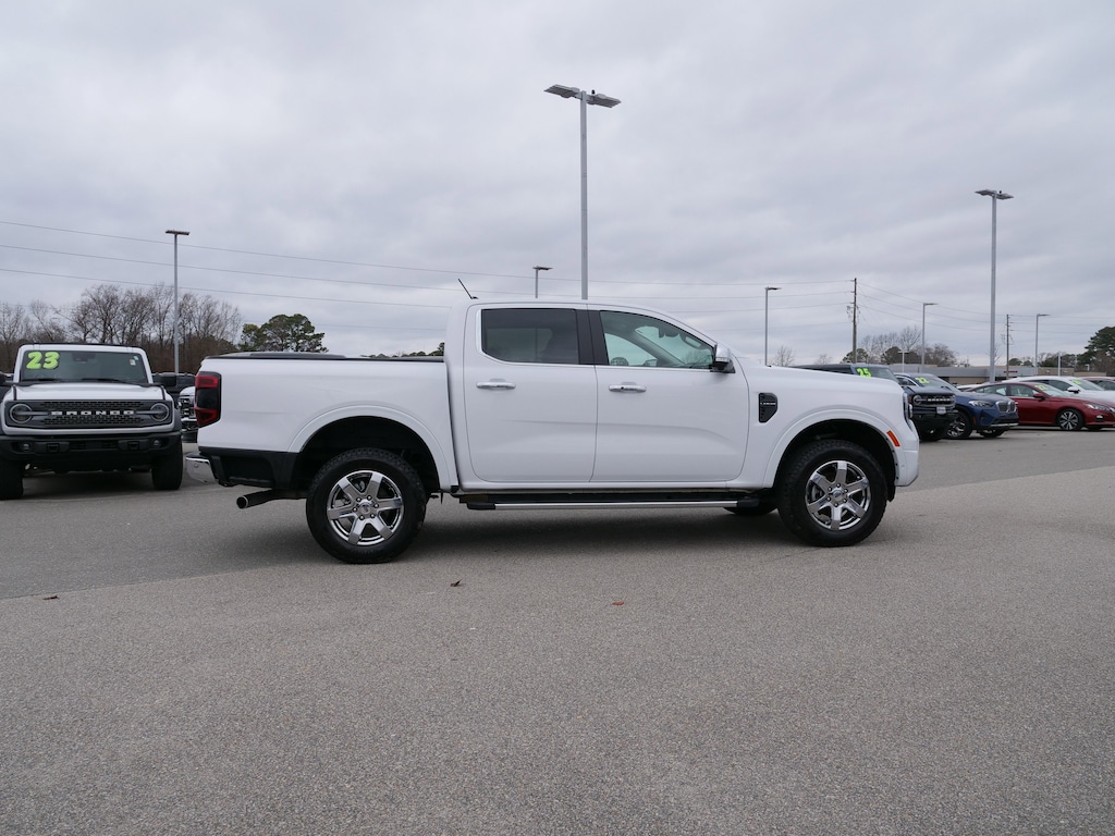 Oxford White 2024 Ford Ranger Lariat RWD EcoBoost 2.3L I4 GTDi DOHC Turbocharged VCT 10-Speed Automatic Chrome Appearance Package (Chrome Center Bar & Grille Surround, Chrome Door Handles, Chrome Exhaust Tip, Chrome Fog Lamp Bezel, Chrome Mirror Caps, Chrome Rear Bumper, Painted Body-Color Wheel Lip Molding, and Wheels: 18 Chrome-Like PVD), Equipment Group 500A Standard, Sport Appearance Package (Gray Painted Center Bar & Grille Surround, Gray Painted Front Fascia & Rear Bumper, Gray Painted Wheel Lip Molding, and Sport Box Decal), Trailer Tow Package (Class IV Trailer Hitch Receiver), 10 Speakers, 3.73 Axle Ratio, 4-Wheel Disc Brakes, ABS brakes, Air Conditioning, Alloy wheels, AM/FM radio: SiriusXM, Auto High-beam Headlights, Auto-dimming Rear-View mirror, Automatic temperature control, Body-Color SecuriCode Keyless Entry Keypad, Brake assist, Chrome Running Boards, Compass, Delay-off headlights, Driver door bin, Driver vanity mirror, Dual front impact airbags, Dual front side impact airbags, Electronic Stability Control, Emergency communication system: SYNC 4 911 Assist, Exterior Parking Camera Rear, Front anti-roll bar, Front Bucket Seats, Front Center Armrest, Front dual zone A/C, Front fog lights, Front License Plate Bracket, Front reading lights, Front wheel independent suspension, Fully automatic headlights, Garage door transmitter, Heated door mirrors, Heated front seats, Heated steering wheel, Illuminated entry, Integrated Box Side Step, Leather Shift Knob, Leather steering wheel, Leather-Trimmed Front Heated Bucket Seats, Low tire pressure warning, Memory seat, Navigation system: Connected Navigation, Occupant sensing airbag, Outside temperature display, Overhead airbag, Overhead console, Panic alarm, Passenger door bin, Passenger vanity mirror, Power door mirrors, Power driver seat, Power passenger seat, Power steering, Power windows, Radio: B&O Sound System by Bang & Olufsen, Rain sensing wipers, Rear reading lights, Rear seat center armrest, Rear step bumper, Rear window defroster, Remote keyless entry, Security system, SiriusXM Satellite Radio, Speed control, Speed-sensing steering, Steering wheel mounted audio controls, SYNC 4A w/Connected Built-In Navigation, Telescoping steering wheel, Tilt steering wheel, Traction control, Tray Style Floor Liner, Trip computer, Turn signal indicator mirrors, Variably intermittent wipers, Voltmeter, and Wheels: 18 Machined Aluminum w/Dark Pockets.