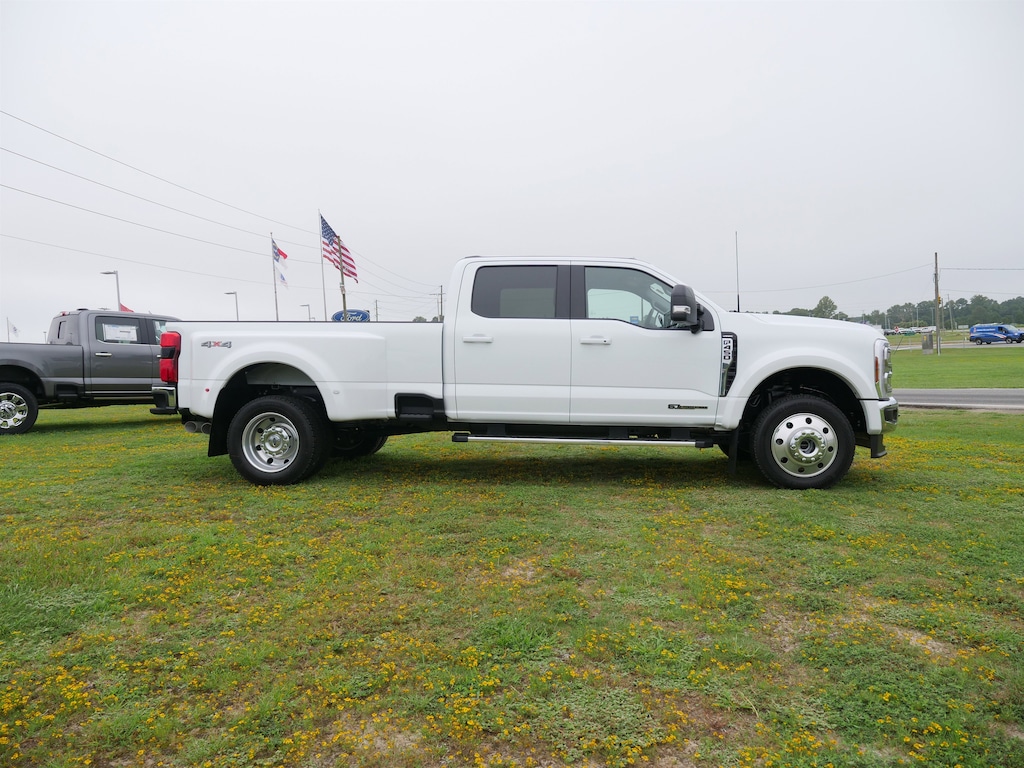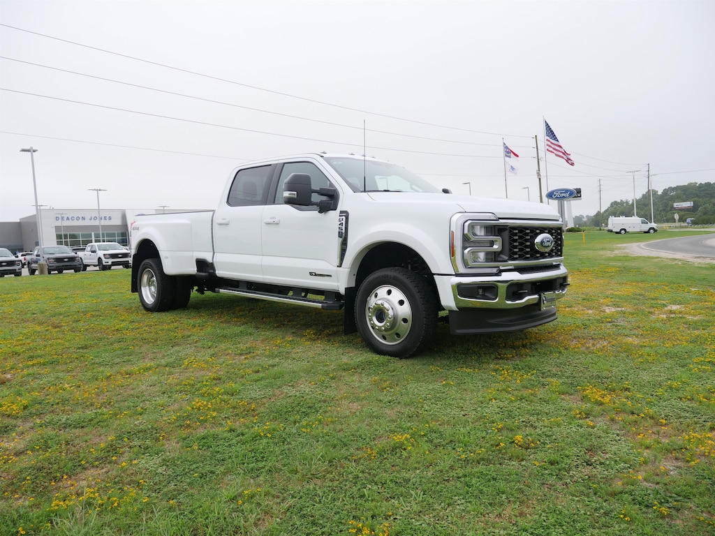 White / Black 2025 Ford F-450SD Lariat DRW 4WD Power Stroke 6.7L V8 DI 32V OHV Turbodiesel 10-Speed Automatic GVWR: 14,000 lb Payload Package, 4WD, 19.5 Forged Polished Aluminum Wheels, 4-Wheel Disc Brakes, ABS brakes, Air Conditioning, Alloy wheels, Brake assist, Compass, Delay-off headlights, Dual front impact airbags, Dual front side impact airbags, Dual rear wheels, Electronic Stability Control, Emergency communication system: SYNC 4 911 Assist, Engine Block Heater, Front anti-roll bar, Front License Plate Bracket, Front reading lights, Fully automatic headlights, Heated door mirrors, Illuminated entry, Limited Slip w/4.30 Axle Ratio, Outside temperature display, Overhead airbag, Overhead console, Panic alarm, Passenger vanity mirror, Power door mirrors, Power steering, Power windows, Rear anti-roll bar, Rear reading lights, Rear step bumper, Remote keyless entry, Security system, Speed control, Split folding rear seat, Steering wheel mounted audio controls, Tachometer, Telescoping steering wheel, Tilt steering wheel, Traction control, Trip computer, Turn signal indicator mirrors, and Variably intermittent wipers.
