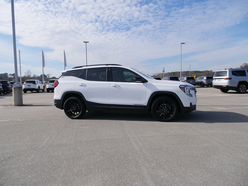 Summit White 2024 GMC Terrain SLT 1.5L DOHC 9-Speed Automatic FWD Elevation Edition (Black GMC Center Caps w/Red GMC Lettering, Black Mirror Caps, Darkened Front Grille, Roof-Mounted Luggage Rack Side Rails, and Wheels: 19 Gloss Black Aluminum), GMC Pro Safety Plus (Adaptive Cruise Control, Lane Change Alert w/Side Blind Zone Alert, Rear Cross-Traffic Alert, Rear Park Assist, and Safety Alert Seat), Preferred Equipment Group 4SA, 2 USB Data Ports, 2 USB Data Ports w/SD Card Reader, 3.47 Final Drive Axle Ratio, 4-Wheel Disc Brakes, 6 Speakers, 6-Speaker Audio System Feature, 6-Way Power Front Passenger Seat, 8-Way Power Driver Seat Adjuster, ABS brakes, Air Conditioning, Alloy wheels, AM/FM radio: SiriusXM, Auto High-beam Headlights, Auto-dimming Rear-View mirror, Automatic temperature control, Bluetooth® For Phone, Brake assist, Bumpers: body-color, Compass, Delay-off headlights, Driver & Front Passenger Heated Seats, Driver door bin, Driver vanity mirror, Dual front impact airbags, Dual front side impact airbags, Electronic Stability Control, Emergency communication system: OnStar and GMC connected services capable, Four wheel independent suspension, Front anti-roll bar, Front Bucket Seats, Front Center Armrest, Front dual zone A/C, Front fog lights, Front Passenger 2-Way Power Lumbar, Front reading lights, Fully automatic headlights, Garage door transmitter, Heated door mirrors, Heated front seats, Heated steering wheel, Illuminated entry, Low tire pressure warning, Memory seat, Occupant sensing airbag, Outside temperature display, Overhead airbag, Overhead console, Panic alarm, Passenger door bin, Passenger vanity mirror, Perforated Leather-Appointed Seat Trim, Power door mirrors, Power Driver Lumbar Control, Power driver seat, Power Liftgate, Power passenger seat, Power steering, Power windows, Radio data system, Radio: GMC Infotainment Audio System w/8 Display, Rear anti-roll bar, Rear seat center armrest, Rear window defroster, Rear window wiper, Remote keyless entry, Roof rack: rails only, Security system, SiriusXM, Skyscape Power Sunroof w/Power Sunscreen, Speed control, Speed-sensing steering, Split folding rear seat, Spoiler, Steering wheel mounted audio controls, Tachometer, Telescoping steering wheel, Tilt steering wheel, Traction control, Trip computer, Turn signal indicator mirrors, Variably intermittent wipers, Wheels: 18 x 7 Silver Painted Aluminum, and Wireless Apple CarPlay/Wireless Android Auto.