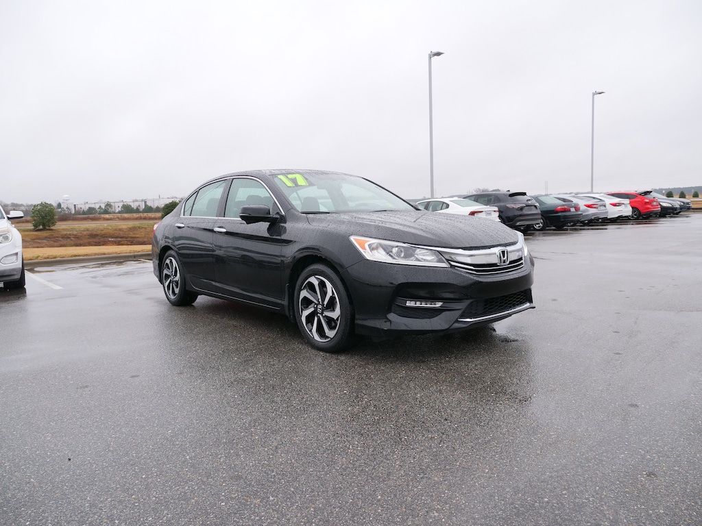 Crystal Black Pearl 2017 Honda Accord EX-L V6 3.5L V6 SOHC i-VTEC 24V 6-Speed Automatic FWD Blk Trimmed Seats Leather, 17 Alloy Wheels, 4-Wheel Disc Brakes, 7 Speakers, ABS brakes, Air Conditioning, Alloy wheels, AM/FM radio: SiriusXM, Apple CarPlay/Android Auto, Auto-dimming Rear-View mirror, Automatic temperature control, Brake assist, Bumpers: body-color, CD player, Compass, Delay-off headlights, Driver door bin, Driver vanity mirror, Dual front impact airbags, Dual front side impact airbags, Electronic Stability Control, Emergency communication system: HondaLink, Exterior Parking Camera Rear, Four wheel independent suspension, Front anti-roll bar, Front Bucket Seats, Front Center Armrest, Front dual zone A/C, Front fog lights, Front reading lights, Fully automatic headlights, Garage door transmitter: HomeLink, Heated door mirrors, Heated Front Bucket Seats, Heated front seats, Illuminated entry, Leather-Trimmed Seats, Low tire pressure warning, Memory seat, Occupant sensing airbag, Outside temperature display, Overhead airbag, Overhead console, Panic alarm, Passenger door bin, Passenger vanity mirror, Power door mirrors, Power driver seat, Power moonroof, Power passenger seat, Power steering, Power windows, Radio data system, Radio: 360-Watt AM/FM/HD Premium Audio System, Rear anti-roll bar, Rear seat center armrest, Rear window defroster, Remote keyless entry, Security system, Speed control, Speed-sensing steering, Speed-Sensitive Wipers, Split folding rear seat, Steering wheel mounted audio controls, Tachometer, Telescoping steering wheel, Tilt steering wheel, Traction control, Trip computer, Turn signal indicator mirrors, and Variably intermittent wipers.