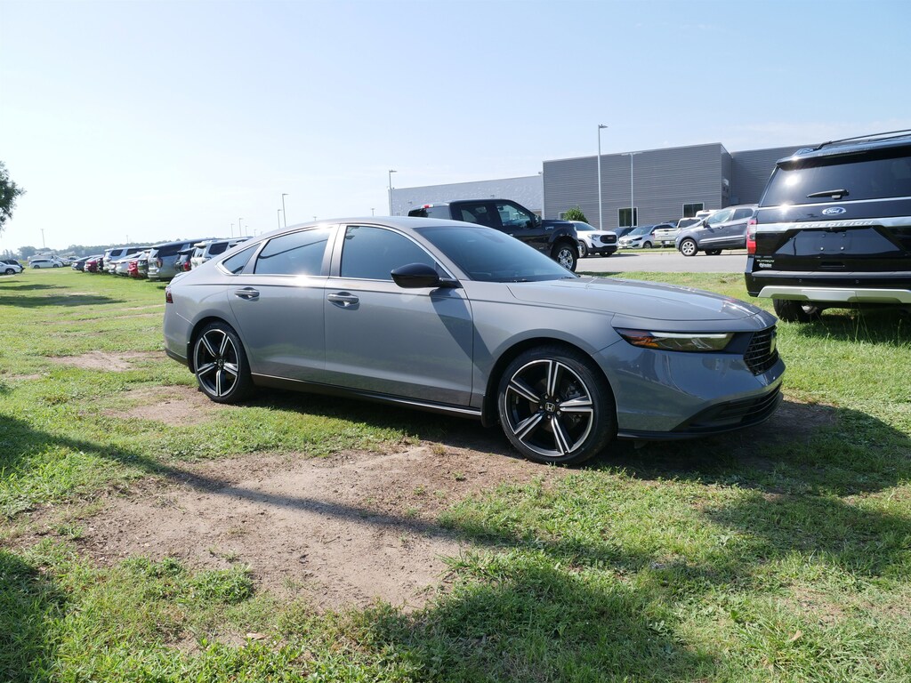 Recent Arrival! Urban Gray 2023 Honda Accord Hybrid Sport 2.0L 16V DOHC eCVT FWD 2.0L 16V DOHC, 4-Wheel Disc Brakes, 8 Speakers, ABS brakes, Adaptive Cruise Control: Adaptive Cruise Control (ACC) with Low-Speed Follow, Air Conditioning, Alloy wheels, AM/FM radio, Apple CarPlay/Android Auto, Auto High-beam Headlights, Automatic temperature control, Blind Spot Information (BSI) System warning, Brake assist, Bumpers: body-color, Compass, Delay-off headlights, Driver door bin, Driver vanity mirror, Dual front impact airbags, Dual front side impact airbags, Electronic Stability Control, Emergency communication system: HondaLink, Exterior Parking Camera Rear, Fabric Seat Trim, Four wheel independent suspension, Front anti-roll bar, Front Bucket Seats, Front Center Armrest, Front dual zone A/C, Front reading lights, Fully automatic headlights, Illuminated entry, Knee airbag, Lane departure: Lane Keeping Assist System (LKAS) active, Leather Shift Knob, Leather steering wheel, Low tire pressure warning, Occupant sensing airbag, Outside temperature display, Overhead airbag, Overhead console, Panic alarm, Passenger door bin, Passenger vanity mirror, Power door mirrors, Power driver seat, Power moonroof, Power steering, Power windows, Radio data system, Radio: 180-Watt Audio System, Rear anti-roll bar, Rear reading lights, Rear seat center armrest, Rear side impact airbag, Rear window defroster, Remote keyless entry, Security system, Speed control, Speed-sensing steering, Speed-Sensitive Wipers, Split folding rear seat, Spoiler, Steering wheel mounted audio controls, Telescoping steering wheel, Tilt steering wheel, Traction control, Trip computer, Variably intermittent wipers, and Wheels: 19 x 8.5J Berlina Black.