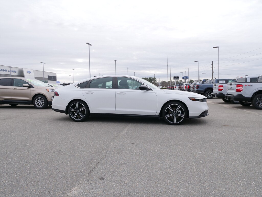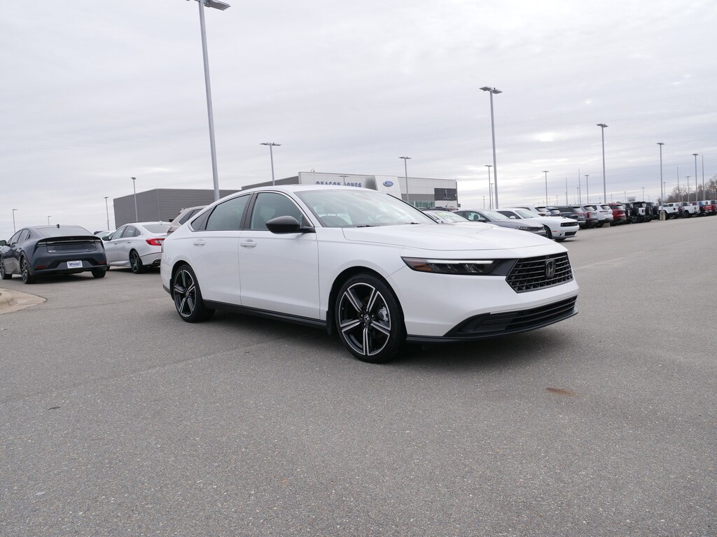 2023 Honda Accord Hybrid Sport FWD 2.0L 16V DOHC eCVT 2.0L 16V DOHC, 4-Wheel Disc Brakes, 8 Speakers, ABS brakes, Adaptive Cruise Control: Adaptive Cruise Control (ACC) with Low-Speed Follow, Air Conditioning, Alloy wheels, AM/FM radio, Apple CarPlay/Android Auto, Auto High-beam Headlights, Automatic temperature control, Brake assist, Bumpers: body-color, Compass, Delay-off headlights, Driver door bin, Driver vanity mirror, Dual front impact airbags, Dual front side impact airbags, Electronic Stability Control, Emergency communication system: HondaLink, Exterior Parking Camera Rear, Fabric Seat Trim, Four wheel independent suspension, Front anti-roll bar, Front Bucket Seats, Front Center Armrest, Front dual zone A/C, Front reading lights, Fully automatic headlights, Illuminated entry, Knee airbag, Lane departure: Lane Keeping Assist System (LKAS) active, Leather Shift Knob, Leather steering wheel, Low tire pressure warning, Occupant sensing airbag, Outside temperature display, Overhead airbag, Overhead console, Panic alarm, Passenger door bin, Passenger vanity mirror, Power door mirrors, Power driver seat, Power moonroof, Power steering, Power windows, Radio data system, Radio: 180-Watt Audio System, Rear anti-roll bar, Rear reading lights, Rear seat center armrest, Rear side impact airbag, Rear window defroster, Remote keyless entry, Security system, Speed control, Speed-sensing steering, Speed-Sensitive Wipers, Split folding rear seat, Spoiler, Steering wheel mounted audio controls, Telescoping steering wheel, Tilt steering wheel, Traction control, Trip computer, Variably intermittent wipers, and Wheels: 19 x 8.5J Berlina Black.