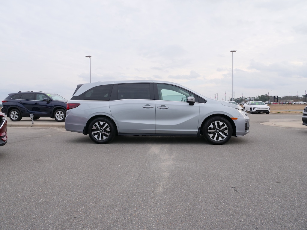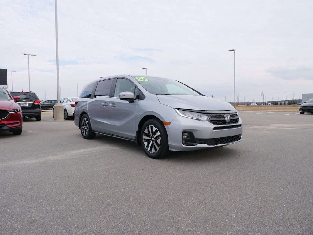 Solar Silver Metallic 2025 Honda Odyssey EX-L FWD 10-Speed Automatic 3.5L V6 SOHC i-VTEC 24V 18" Machine-Finished Alloy Wheels, 3rd row seats: split-bench, 4-Wheel Disc Brakes, 7 Speakers, ABS brakes, Adaptive Cruise Control: Adaptive Cruise Control (ACC) with Low-Speed Follow, Air Conditioning, Alloy wheels, AM/FM radio: SiriusXM, Anti-whiplash front head restraints, Apple CarPlay/Android Auto, Auto High-beam Headlights, Auto-dimming Rear-View mirror, Automatic temperature control, Blind Spot Information (BSI) System warning, Brake assist, Bumpers: body-color, Delay-off headlights, Driver door bin, Driver vanity mirror, Driver's Seat Mounted Armrest, Dual front impact airbags, Dual front side impact airbags, Electronic Stability Control, Exterior Parking Camera Rear, Four wheel independent suspension, Front anti-roll bar, Front Bucket Seats, Front dual zone A/C, Front fog lights, Front reading lights, Fully automatic headlights, Garage door transmitter: HomeLink, Heated door mirrors, Heated Front Bucket Seats, Heated front seats, Illuminated entry, Knee airbag, Lane departure: Lane Keeping Assist System (LKAS) active, Leather steering wheel, Leather Trimmed Seats, Low tire pressure warning, Memory seat, Occupant sensing airbag, Outside temperature display, Overhead airbag, Overhead console, Panic alarm, Passenger door bin, Passenger seat mounted armrest, Passenger vanity mirror, Power door mirrors, Power driver seat, Power Liftgate, Power moonroof, Power passenger seat, Power steering, Power windows, Radio data system, Radio: 160-Watt AM/FM/HD/SiriusXM Audio System, Rear air conditioning, Rear anti-roll bar, Rear reading lights, Rear seat center armrest, Rear window defroster, Rear window wiper, Reclining 3rd row seat, Remote keyless entry, Security system, Speed control, Speed-sensing steering, Speed-Sensitive Wipers, Split folding rear seat, Spoiler, Steering wheel mounted audio controls, Tachometer, Telescoping steering wheel, Tilt steering wheel, Traction control, Trip computer, Turn signal indicator mirrors, and Variably intermittent wipers.