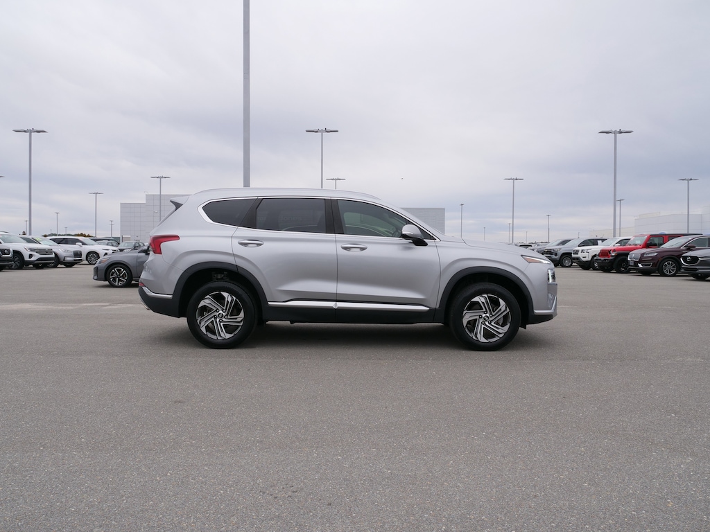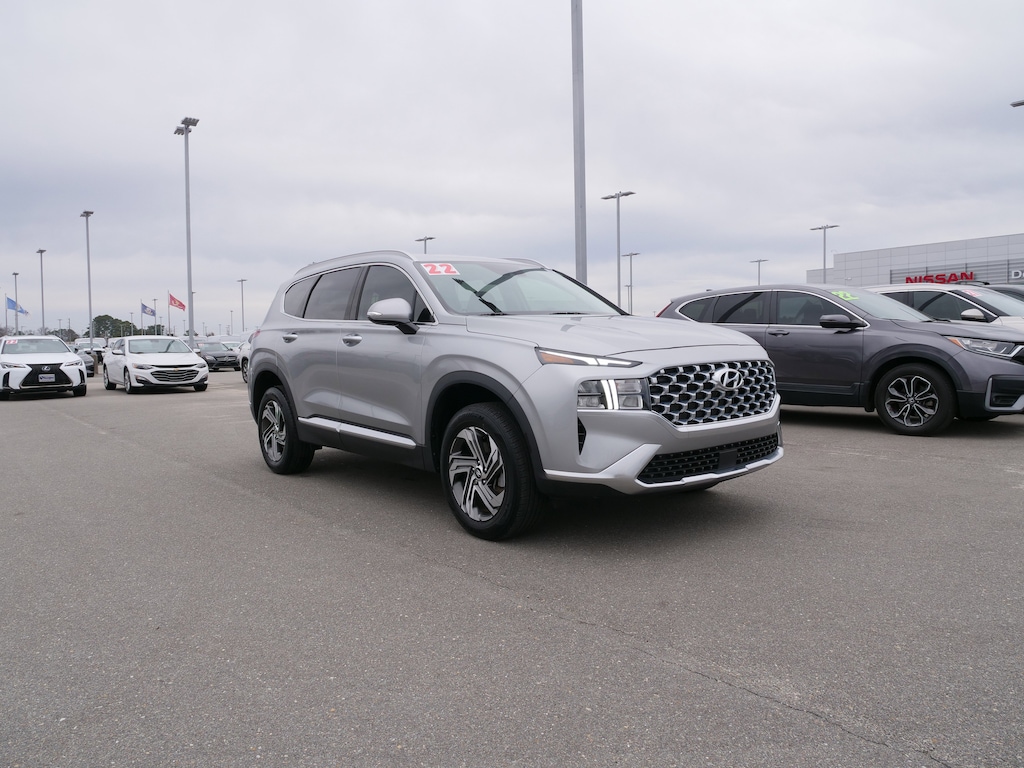 Shimmering Silver Pearl 2022 Hyundai Santa Fe SEL 2.5L I4 8-Speed Automatic with SHIFTRONIC AWD Convenience Package (DISC) (12.3 LCD Multi-Information Display, Acoustic-Laminated Front Side Windows, Auto-Dimming Rear-View Mirror, Dual Automatic Temperature Control, Hands-Free Smart Liftgate w/Hands-Free Auto Open, Heated Side Mirrors w/Turn Signal Indicators, Hyundai Digital Key, Leather Wrapped Steering Wheel, Manual Rear Side Sunshades, Option Group 02, Power Release 2nd Row Seats, Puddle Lamps, and Ultrasonic Rear Occupant Alert), AWD, Black Cloth, 18 x 7.5J Alloy Wheels, 4-Wheel Disc Brakes, 6 Speakers, ABS brakes, Air Conditioning, Alloy wheels, AM/FM radio: SiriusXM, Apple CarPlay & Android Auto, Auto High-beam Headlights, Axle Ratio: 4.081, Brake assist, Bumpers: body-color, Cargo Cover/Screen, Cargo Net, Carpeted Floor Mats, Delay-off headlights, Driver door bin, Driver vanity mirror, Dual front impact airbags, Dual front side impact airbags, Electronic Stability Control, Emergency communication system, Exterior Parking Camera Rear, Four wheel independent suspension, Front anti-roll bar, Front Bucket Seats, Front Center Armrest, Front reading lights, Fully automatic headlights, Heated door mirrors, Heated Front Bucket Seats, Heated front seats, Illuminated entry, Low tire pressure warning, Occupant sensing airbag, Outside temperature display, Overhead airbag, Overhead console, Panic alarm, Passenger door bin, Passenger vanity mirror, Power door mirrors, Power driver seat, Power steering, Power windows, Radio: AM/FM Display Audio, Rear anti-roll bar, Rear seat center armrest, Rear window defroster, Rear window wiper, Remote keyless entry, Security system, Speed control, Speed-sensing steering, Split folding rear seat, Spoiler, Steering wheel mounted audio controls, Tachometer, Telescoping steering wheel, Tilt steering wheel, Traction control, Trip computer, Variably intermittent wipers, Wheel Locks, and YES Essentials Stain-Resistant Cloth Seat Trim.