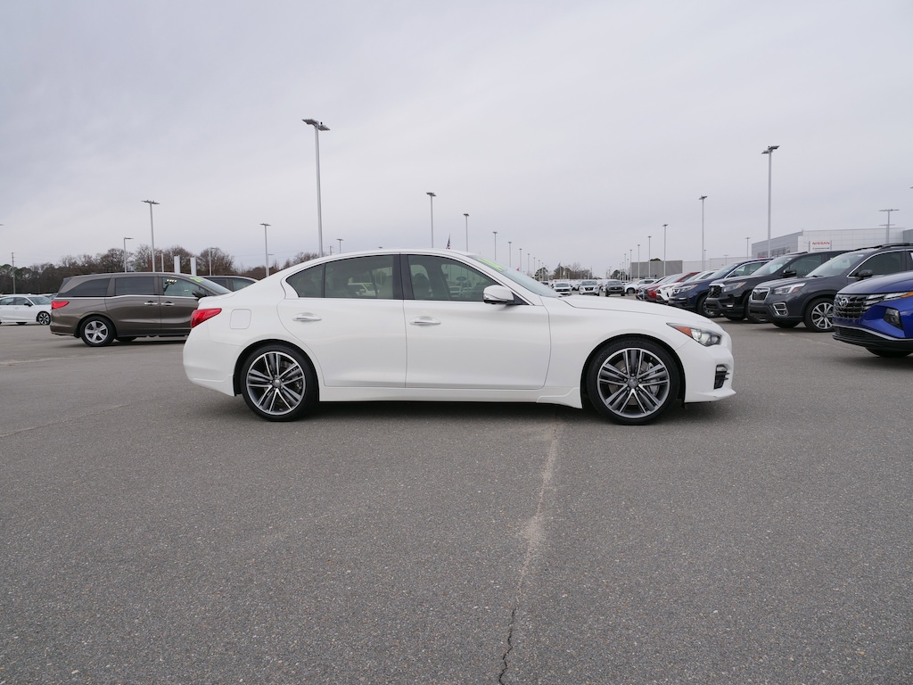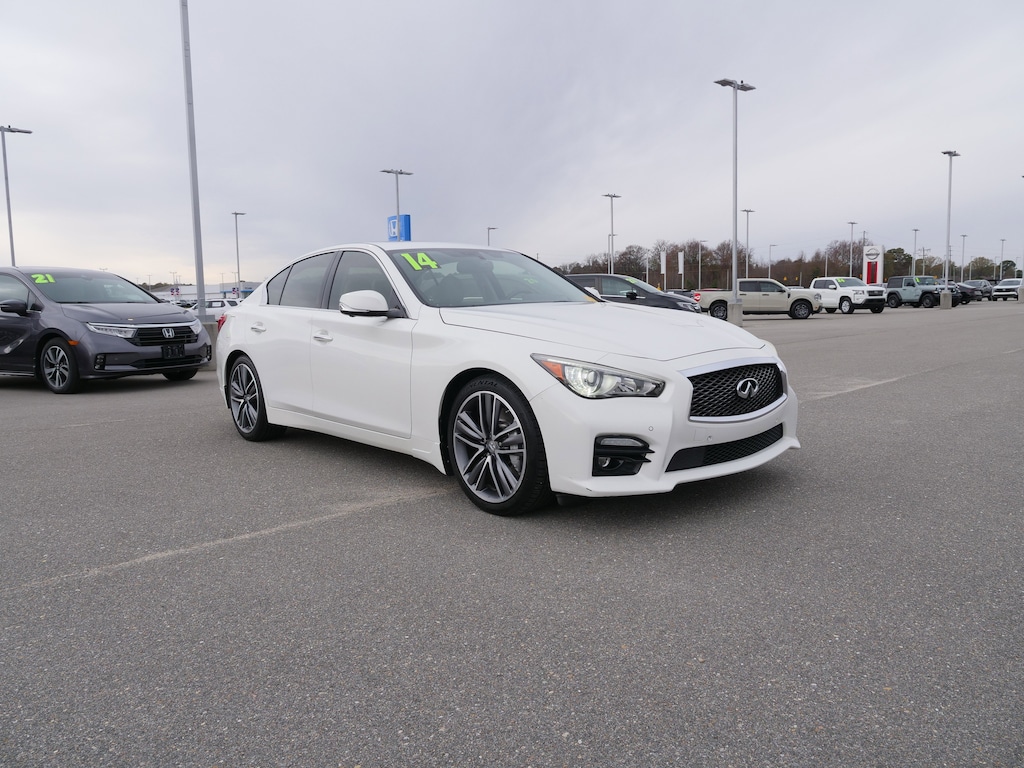 Moonlight White 2014 INFINITI Q50 Sport 3.7L V6 DOHC 24V 7-Speed Automatic with Manual Shift RWD Deluxe Touring Package (60/40 Split-Folding Rear Seats, Around View Monitor w/Moving Object Detection, Auto-Dimming Outside Mirrors w/Reverse Tilt-Down, Direct Adaptive Steering, Dual Occupant Memory System For Driver's Seat, Maple Wood Trim, Power Tilt & Telescopic Steering Column, and Rain-Sensing Front Windshield Wipers), Navigation Package (INFINITI InTouch Navigation System), Spare Tire Package (Jack Kit), Technology Package (Adaptive Front Lighting System, Advanced Climate Control System, Back-Up Collision Intervention, Blind Spot Warning & Intervention Systems, Eco Pedal, Forward Emergency Braking, Front Seat Pre-Crash Seat Belts, High Beam Lighting On/Off Assistance, Intelligent Cruise Control w/Full Speed Range, Lane Departure Prevention & Warning System, and Predictive Forward Collision Warning), 14 Speakers, 4-Wheel Disc Brakes, ABS brakes, Activation Disclaimer, Air Conditioning, Alloy wheels, AM/FM radio: SiriusXM, Anti-whiplash front head restraints, Auto-dimming Rear-View mirror, Automatic temperature control, BOSE Centerpoint Simulated Surround, Brake assist, Bumpers: body-color, CD player, Compass, Delay-off headlights, Driver door bin, Driver vanity mirror, Dual front impact airbags, Dual front side impact airbags, Electronic Stability Control, Floor Mats, Four wheel independent suspension, Front anti-roll bar, Front Bucket Seats, Front Center Armrest, Front dual zone A/C, Front fog lights, Front reading lights, Fully automatic headlights, Garage door transmitter: HomeLink, Heated door mirrors, Heated front seats, Heated Sport Front Seats, Illuminated entry, INFINITI Studio on Wheels by Bose, Leather Shift Knob, Leather steering wheel, Leather-Appointed Seats, Literature Kit, Low tire pressure warning, Occupant sensing airbag, Outside temperature display, Overhead airbag, Overhead console, Panic alarm, Passenger door bin, Passenger vanity mirror, Power door mirrors, Power driver seat, Power moonroof, Power passenger seat, Power steering, Power windows, Radio data system, Radio: AM/FM/CD w/MP3 Playback Capability, Rear anti-roll bar, Rear reading lights, Rear seat center armrest, Rear window defroster, Remote keyless entry, Security system, Speed control, Speed-sensing steering, Speed-Sensitive Wipers, Sport steering wheel, Steering wheel mounted audio controls, Tachometer, Telescoping steering wheel, Tilt steering wheel, Traction control, Trip computer, Turn signal indicator mirrors, Variably intermittent wipers, and Wheels: 19 Aluminum-Alloy Sport.