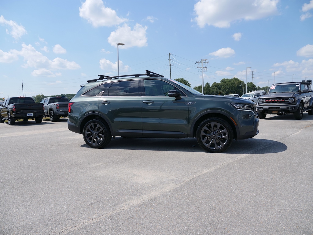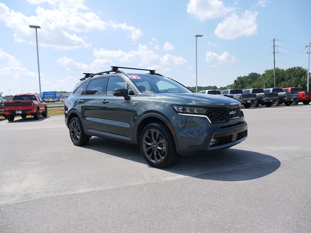 Aruba Green 2022 Kia Sorento X-Line SX Prestige 2.5L I4 DGI Turbocharged DOHC 16V LEV3-ULEV70 281hp 8-Speed DCT AWD Rust Color Package, AWD, 12 Speakers, 3.316 Axle Ratio, 3rd row seats: split-bench, 4-Wheel Disc Brakes, ABS brakes, Air Conditioning, Alloy wheels, AM/FM radio: SiriusXM, Apple CarPlay & Android Auto, Auto High-beam Headlights, Auto-dimming Rear-View mirror, Automatic temperature control, Brake assist, Bumpers: body-color, Carpeted Floor Mats, Cross Bars X-Line, Delay-off headlights, Driver door bin, Driver vanity mirror, Dual front impact airbags, Dual front side impact airbags, Electronic Stability Control, Emergency communication system: UVO Link, Four wheel independent suspension, Front anti-roll bar, Front Bucket Seats, Front Center Armrest, Front dual zone A/C, Front fog lights, Front reading lights, Fully automatic headlights, Heated & Ventilated Front Bucket Seats, Heated door mirrors, Heated front seats, Heated rear seats, Heated steering wheel, Illuminated entry, Knee airbag, Leather steering wheel, Low tire pressure warning, Memory seat, Navigation System, Occupant sensing airbag, Outside temperature display, Overhead airbag, Overhead console, Panic alarm, Passenger door bin, Passenger vanity mirror, Perforated Genuine Leather Seat Trim, Power door mirrors, Power driver seat, Power Liftgate, Power moonroof, Power passenger seat, Power steering, Power windows, Radio data system, Radio: AM/FM Bose Premium Audio System, Rear air conditioning, Rear anti-roll bar, Rear reading lights, Rear window defroster, Rear window wiper, Rear-Seat Entertainment, Remote keyless entry, Roof rack: rails only, Security system, Smart Key w/ Push Button and Remote Start, Speed control, Speed-sensing steering, Split folding rear seat, Spoiler, Steering wheel mounted audio controls, Tachometer, Telescoping steering wheel, Tilt steering wheel, Traction control, Trip computer, Turn signal indicator mirrors, Variably intermittent wipers, Ventilated front seats, and Wheels: 8.5J x 20 Matte Gray Alloy.