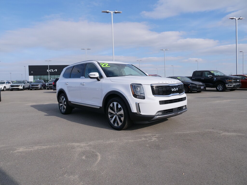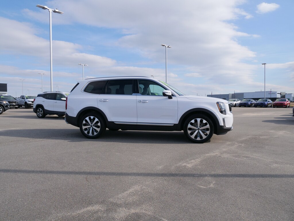 Glacial White Pearl 2022 Kia Telluride S FWD 8-Speed Automatic 3.8L V6 DOHC 20" x 7.5" Machined Alloy Wheels, 3.648 Axle Ratio, 3rd row seats: split-bench, 4-Wheel Disc Brakes, 6 Speakers, ABS brakes, Air Conditioning, Alloy wheels, AM/FM radio: SiriusXM, Apple CarPlay & Android Auto, Automatic temperature control, Brake assist, Bumpers: body-color, Carpeted Floor Mats, Delay-off headlights, Driver door bin, Driver vanity mirror, Dual front impact airbags, Dual front side impact airbags, Electronic Stability Control, Emergency communication system: 911 Connect, Four wheel independent suspension, Front anti-roll bar, Front Bucket Seats, Front Center Armrest, Front dual zone A/C, Front reading lights, Fully automatic headlights, Heated door mirrors, Heated Front Bucket Seats, Heated front seats, Illuminated entry, Knee airbag, Leather Shift Knob, Leather steering wheel, Low tire pressure warning, Navigation System, Occupant sensing airbag, Outside temperature display, Overhead airbag, Overhead console, Panic alarm, Passenger door bin, Passenger vanity mirror, Power door mirrors, Power driver seat, Power moonroof, Power steering, Power windows, Radio data system, Radio: AM/FM Display Audio System, Rear air conditioning, Rear anti-roll bar, Rear audio controls, Rear reading lights, Rear window defroster, Rear window wiper, Reclining 3rd row seat, Remote keyless entry, Roof rack: rails only, Security system, Smart Key w/ Push Button and Remote Start, Speed control, Speed-sensing steering, Split folding rear seat, Spoiler, Steering wheel mounted audio controls, Synthetic Leather Seat Trim, Tachometer, Telescoping steering wheel, Tilt steering wheel, Traction control, Trip computer, Turn signal indicator mirrors, and Variably intermittent wipers.