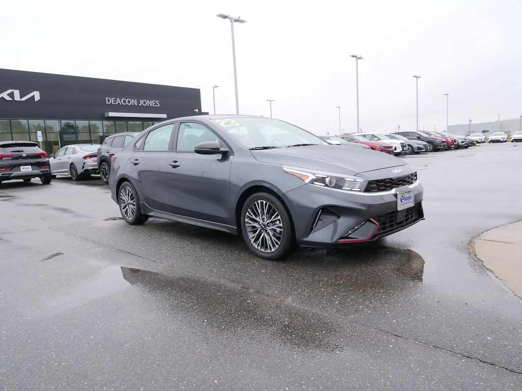 Gravity Gray 2023 Kia Forte GT-Line FWD CVT 2.0L I4 MPI GT-Line Technology Package (Electronic Parking Brake (EPB), Forward Collision Avoidance-Assist - Cyclist, Navigation-Based Smart Cruise Control (NSCC), and Smart Cruise Control w/Stop & Go), 17" x 7.0J Alloy Wheels, 4-Wheel Disc Brakes, 6 Speakers, ABS brakes, Air Conditioning, Alloy wheels, AM/FM radio: SiriusXM, Apple CarPlay & Android Auto, Auto High-beam Headlights, Automatic temperature control, Brake assist, Bumpers: body-color, Cargo Net, Carpet Floor Mats, Cloth & SynTex Seat Trim, Delay-off headlights, Driver door bin, Driver vanity mirror, Dual front impact airbags, Dual front side impact airbags, Electronic Stability Control, Emergency communication system, Exterior Parking Camera Rear, Front anti-roll bar, Front Bucket Seats, Front Center Armrest, Front dual zone A/C, Front fog lights, Front reading lights, Front wheel independent suspension, Fully automatic headlights, Heated door mirrors, Illuminated entry, Leather Shift Knob, Leather steering wheel, Low tire pressure warning, Navigation System, Occupant sensing airbag, Outside temperature display, Overhead airbag, Overhead console, Panic alarm, Passenger door bin, Passenger vanity mirror, Power door mirrors, Power steering, Power windows, Radio data system, Radio: 10.25" Display Audio, Rear seat center armrest, Rear window defroster, Remote keyless entry, Security system, Speed control, Split folding rear seat, Spoiler, Sport steering wheel, Steering wheel mounted audio controls, Tachometer, Telescoping steering wheel, Tilt steering wheel, Traction control, Trip computer, Turn signal indicator mirrors, and Variably intermittent wipers.