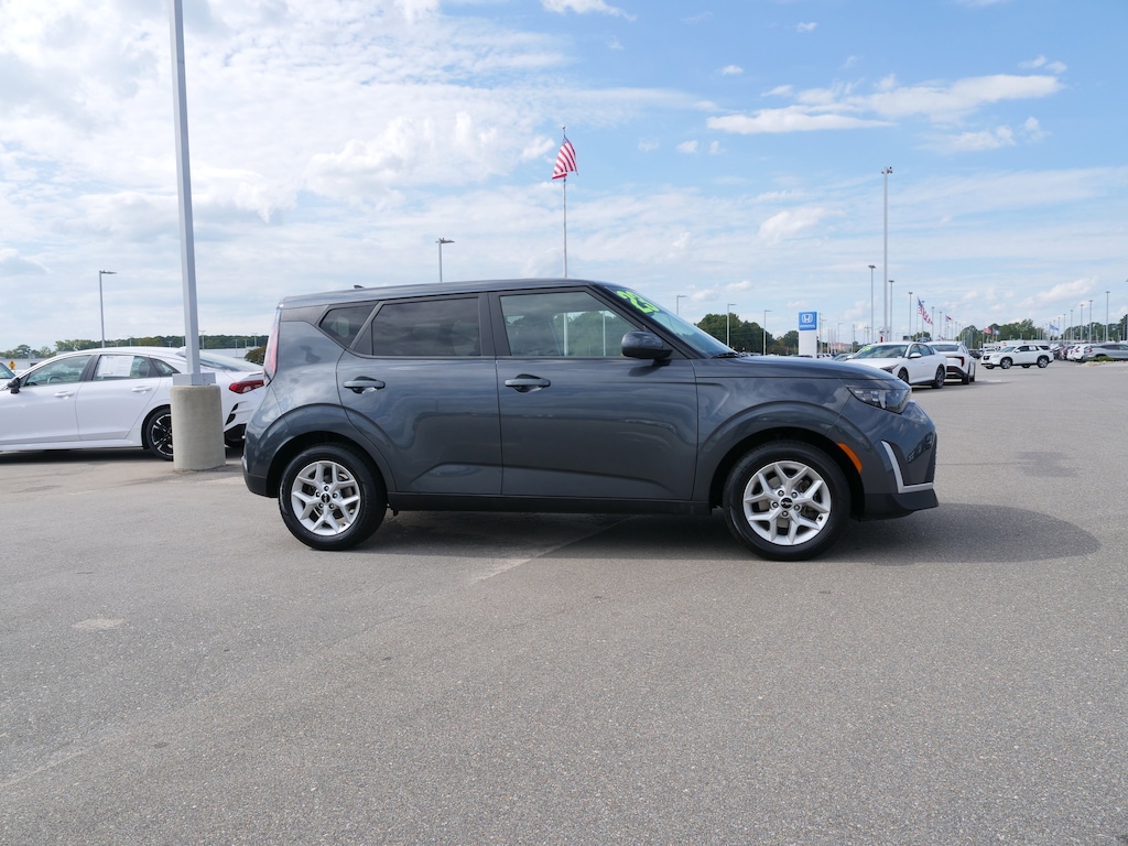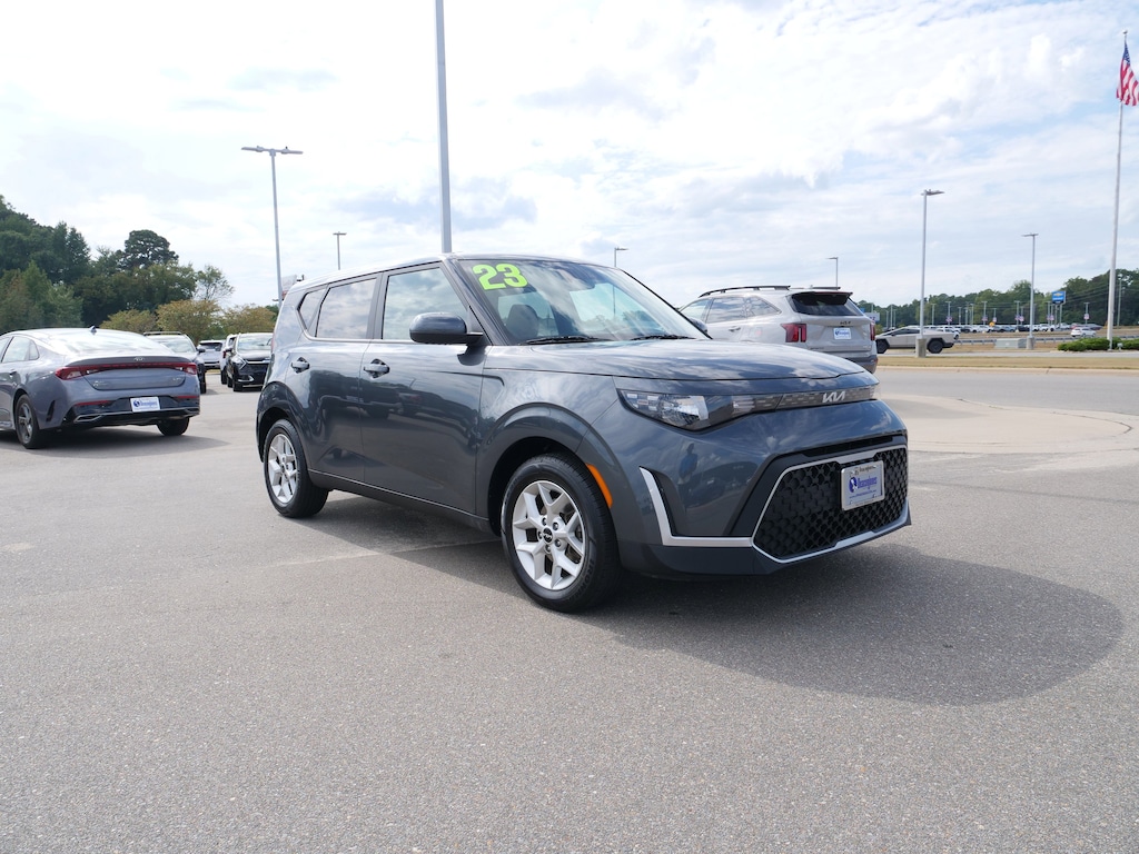 Gravity Gray 2023 Kia Soul LX FWD CVT 2.0L I4 DOHC LX Technology Package (16" Alloy Wheels, Blind-Spot Collision-Avoidance Assist, Lane Change Assist, and Rear Cross-Traffic Collision Avoidance Assist), 16" Steel Wheels, 4-Wheel Disc Brakes, 6 Speakers, ABS brakes, Air Conditioning, AM/FM radio, Apple CarPlay & Android Auto, Auto High-beam Headlights, Brake assist, Bumpers: body-color, Carpeted Floor Mats, Compass, Delay-off headlights, Driver door bin, Driver vanity mirror, Dual front impact airbags, Dual front side impact airbags, Electronic Stability Control, Exterior Parking Camera Rear, Front anti-roll bar, Front Bucket Seats, Front Center Armrest, Front reading lights, Front wheel independent suspension, Fully automatic headlights, Illuminated entry, Low tire pressure warning, Occupant sensing airbag, Outside temperature display, Overhead airbag, Overhead console, Panic alarm, Passenger door bin, Passenger vanity mirror, Power door mirrors, Power steering, Power windows, Radio data system, Radio: AM/FM/MP3/HD Audio System, Rear window defroster, Rear window wiper, Remote keyless entry, Speed control, Speed-sensing steering, Split folding rear seat, Steering wheel mounted audio controls, Tachometer, Telescoping steering wheel, Tilt steering wheel, Traction control, Trip computer, Variably intermittent wipers, and Woven & Tricot Cloth Seat Trim.