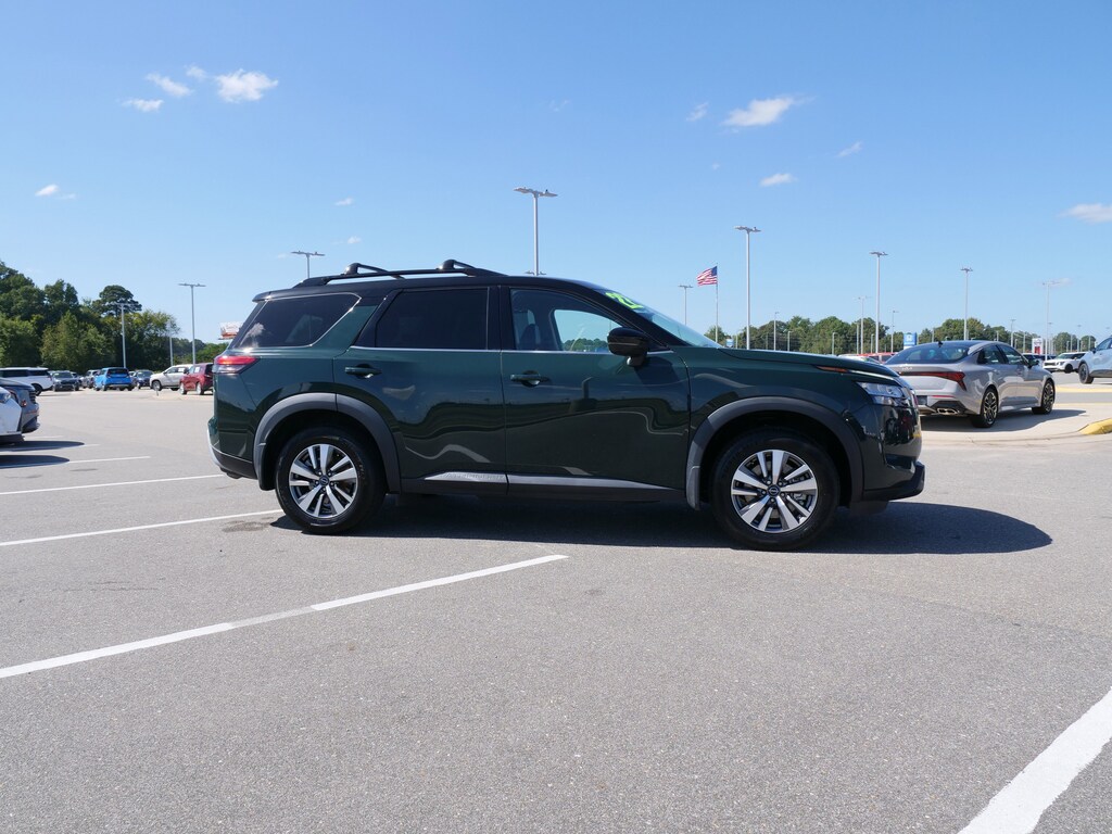 Obsidian Green Pearl/Super Black 2022 Nissan Pathfinder SL FWD 9-Speed Automatic V6 18" Machined Alloy Wheels, 3rd row seats: bench, 4-Wheel Disc Brakes, 6 Speakers, ABS brakes, Air Conditioning, Alloy wheels, AM/FM radio: SiriusXM, Auto High-beam Headlights, Auto-dimming Rear-View mirror, Automatic temperature control, Axle Ratio: TBD, Bench Seat Carpeted Floor Mats (Set of 4), Black Splash Guards (Set of 4), Brake assist, Bumpers: body-color, Cross Bars, Delay-off headlights, Driver door bin, Driver vanity mirror, Dual front impact airbags, Dual front side impact airbags, Electronic Stability Control, Emergency communication system: NissanConnect Services, Exterior Parking Camera Rear, Four wheel independent suspension, Front anti-roll bar, Front Bucket Seats, Front Center Armrest, Front dual zone A/C, Front fog lights, Front reading lights, Fully automatic headlights, Garage door transmitter: HomeLink, Heated door mirrors, Heated Front Bucket Seats, Heated front seats, Heated steering wheel, Illuminated entry, Knee airbag, Leather Seating Surfaces, Leather steering wheel, Low tire pressure warning, Navigation system: NissanConnect Navigation, NissanConnect w/Navigation & Services, Occupant sensing airbag, Outside temperature display, Overhead airbag, Overhead console, Panic alarm, Passenger door bin, Passenger vanity mirror, Power door mirrors, Power driver seat, Power Liftgate, Power passenger seat, Power steering, Power windows, Radio data system, Radio: AM/FM Audio System, Rear air conditioning, Rear anti-roll bar, Rear reading lights, Rear seat center armrest, Rear side impact airbag, Rear window defroster, Rear window wiper, Reclining 3rd row seat, Remote keyless entry, Security system, Speed control, Speed-sensing steering, Split folding rear seat, Spoiler, Steering wheel mounted audio controls, Tachometer, Telescoping steering wheel, Tilt steering wheel, Traction control, Trip computer, Turn signal indicator mirrors, and Variably intermittent wipers.