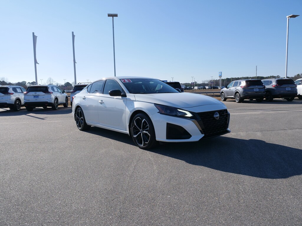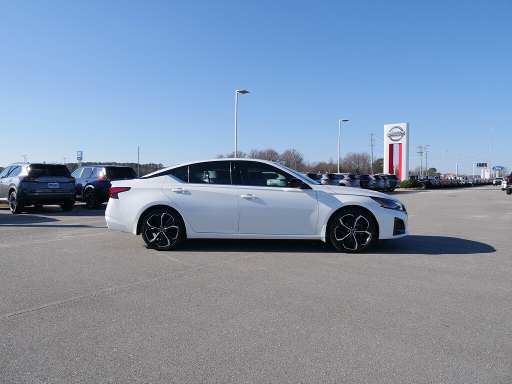 Pearl White Tricoat 2023 Nissan Altima 2.5 SR 2.5L 4-Cylinder DOHC 16V CVT with Xtronic FWD SR Premium Package (Black Outside Mirrors, Heated Front Seats, Leather-Appointed Seat Trim, NissanConnect, Premium Sport Interior Finishers, and Single Panel Moonroof), CVT with Xtronic, 20 Color Interior Accent Lighting, 4-Wheel Disc Brakes, 6 Speakers, ABS brakes, Air Conditioning, Alloy wheels, AM/FM radio: SiriusXM, Auto High-beam Headlights, Blind Spot Warning, Body-Colored Rear Spoiler, Body-Colored Splash Guards, Brake assist, Bumpers: body-color, Chrome Bumper Protector, Delay-off headlights, Driver door bin, Driver vanity mirror, Dual front impact airbags, Dual front side impact airbags, Electronic Stability Control, Four wheel independent suspension, Front anti-roll bar, Front Bucket Seats, Front Center Armrest, Front reading lights, Front Sport Bucket Seats, Fully automatic headlights, Illuminated entry, Knee airbag, Leather Shift Knob, Low tire pressure warning, NissanConnect featuring Apple CarPlay and Android Auto, Occupant sensing airbag, Outside temperature display, Overhead airbag, Overhead console, Panic alarm, Passenger door bin, Passenger vanity mirror, Power door mirrors, Power driver seat, Power steering, Power windows, Radio data system, Radio: AM/FM Audio System, Rear anti-roll bar, Rear Parking Sensors, Rear reading lights, Rear seat center armrest, Rear side impact airbag, Rear window defroster, Remote keyless entry, Security system, Speed control, Speed-sensing steering, Speed-Sensitive Wipers, Split folding rear seat, Sport Seat Trim, SR Floor Mats/Trunk Mat/Hideaway Nets, Steering wheel mounted audio controls, Tachometer, Telescoping steering wheel, Tilt steering wheel, Traction control, Trip computer, USB Charging Cable Set - Nissan, Variably intermittent wipers, and Wheels: 19 Sport Alloy.