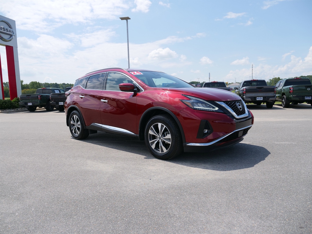 Scarlet Ember Tintcoat 2024 Nissan Murano SV 3.5L V6 DOHC 24V CVT with Xtronic FWD CVT with Xtronic, 4-Wheel Disc Brakes, 4.667 Axle Ratio, 6 Speakers, ABS brakes, Air Conditioning, Alloy wheels, AM/FM radio: SiriusXM, AM/FM/CD/MP3/WMA Audio System, Auto High-beam Headlights, Auto-dimming Rear-View mirror, Automatic temperature control, Blind Spot Warning, Brake assist, Bumpers: body-color, Carpeted Floor Mats & Carpeted Cargo Mat, CD player, Child-Seat-Sensing Airbag, Compass, Delay-off headlights, Driver door bin, Driver vanity mirror, Dual front impact airbags, Dual front side impact airbags, Electronic Stability Control, Four wheel independent suspension, Front anti-roll bar, Front Bucket Seats, Front Center Armrest, Front dual zone A/C, Front fog lights, Front reading lights, Fully automatic headlights, Heated door mirrors, Heated Front Bucket Seats, Heated front seats, Illuminated entry, Knee airbag, Leather steering wheel, Leatherette-Appointed Seat Trim, Low tire pressure warning, NissanConnect featuring Apple CarPlay and Android Auto, Occupant sensing airbag, Outside temperature display, Overhead airbag, Overhead console, Panic alarm, Passenger door bin, Passenger vanity mirror, Power door mirrors, Power driver seat, Power passenger seat, Power steering, Power windows, Radio data system, Rear anti-roll bar, Rear Bumper Protector, Rear reading lights, Rear seat center armrest, Rear side impact airbag, Rear window defroster, Rear window wiper, Remote keyless entry, Security system, Special Paint - Pearl White Tricoat, Speed control, Speed-sensing steering, Speed-Sensitive Wipers, Splash Guards (B92), Split folding rear seat, Spoiler, Steering wheel mounted audio controls, Tachometer, Telescoping steering wheel, Tilt steering wheel, Traction control, Trip computer, Turn signal indicator mirrors, Variably intermittent wipers, and Wheels: 18 Machined Aluminum-Alloy.