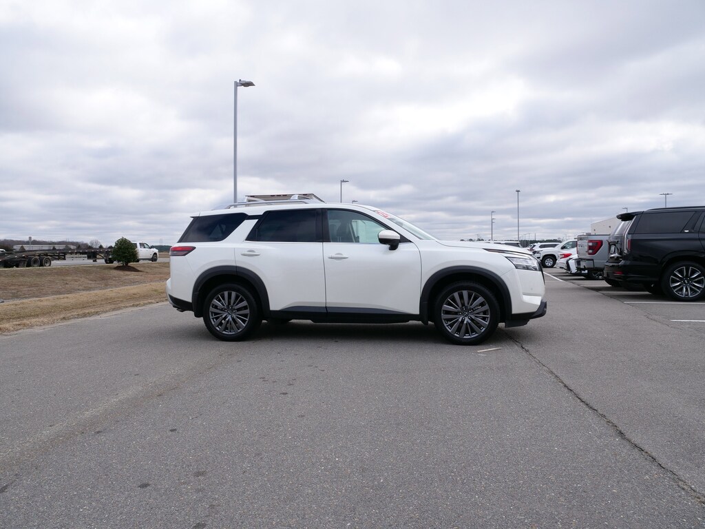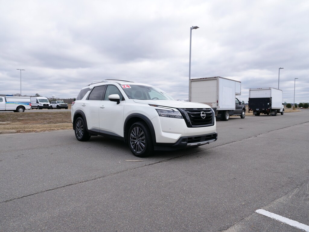 Pearl White Tricoat 2024 Nissan Pathfinder SL 3.5L V6 DOHC 9-Speed Automatic FWD Black Appearance Package (Black Grille (K10) and Black Liftgate Emblems), SL Premium Package (20 Painted Alloy Wheels, 2nd-Row Captain Chairs, 2nd-Row Rear Headrest, Bose Premium Audio System, Heated Rear Seats, Panoramic Moonroof, and Tow Hitch Receiver & Harness), Tow Delete Package (Delete Tow Hitch Receiver & Harness), 3rd row seats: bench, 4-Wheel Disc Brakes, 6 Speakers, ABS brakes, Air Conditioning, Alloy wheels, AM/FM radio: SiriusXM, Auto High-beam Headlights, Auto-dimming Rear-View mirror, Automatic temperature control, Axle Ratio: 4.334, Black Splash Guards (Set of 4), Brake assist, Bumpers: body-color, Captain's Chairs Carpeted Floor Mats (Set of 4), Cross Bars, Delay-off headlights, Driver door bin, Driver vanity mirror, Dual front impact airbags, Dual front side impact airbags, Electronic Stability Control, Emergency communication system, Exterior Parking Camera Rear, Four wheel independent suspension, Front anti-roll bar, Front Bucket Seats, Front Center Armrest, Front dual zone A/C, Front reading lights, Fully automatic headlights, Garage door transmitter: HomeLink, Heated door mirrors, Heated Front Bucket Seats, Heated front seats, Heated steering wheel, Illuminated entry, Knee airbag, Leather steering wheel, Leather-Appointed Seating Surfaces, Low tire pressure warning, Navigation system: NissanConnect with Navigation and Services, NissanConnect featuring Apple CarPlay and Android Auto, NissanConnect w/Navigation & Services, Occupant sensing airbag, Outside temperature display, Overhead airbag, Overhead console, Panic alarm, Passenger door bin, Passenger vanity mirror, Power door mirrors, Power driver seat, Power Liftgate, Power passenger seat, Power steering, Power windows, Radio data system, Radio: AM/FM Audio System, Rear air conditioning, Rear anti-roll bar, Rear reading lights, Rear seat center armrest, Rear side impact airbag, Rear window defroster, Rear window wiper, Reclining 3rd row seat, Remote keyless entry, Security system, Speed control, Speed-sensing steering, Split folding rear seat, Spoiler, Steering wheel mounted audio controls, Tachometer, Telescoping steering wheel, Tilt steering wheel, Traction control, Trip computer, Turn signal indicator mirrors, Variably intermittent wipers, and Wheels: 18 x 8J Machined Alloy.