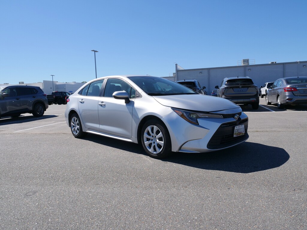 Silver 2024 Toyota Corolla LE 2.0L I4 DOHC 16V CVT FWD 16 Steel Wheels w/Covers, 4-Wheel Disc Brakes, 6 Speakers, ABS brakes, Air Conditioning, AM/FM radio: SiriusXM, Auto High-beam Headlights, Automatic temperature control, Brake assist, Bumpers: body-color, Delay-off headlights, Driver door bin, Driver vanity mirror, Dual front impact airbags, Dual front side impact airbags, Electronic Stability Control, Emergency communication system: Safety Connect (up to 10-year trial subscription), Exterior Parking Camera Rear, Fabric Seat Trim, Front anti-roll bar, Front Bucket Seats, Front Center Armrest, Front reading lights, Front wheel independent suspension, Fully automatic headlights, Illuminated entry, Knee airbag, Low tire pressure warning, Occupant sensing airbag, Outside temperature display, Overhead airbag, Panic alarm, Passenger door bin, Passenger vanity mirror, Power door mirrors, Power steering, Power windows, Radio data system, Radio: 8 Toyota Audio Multimedia, Rear anti-roll bar, Rear seat center armrest, Rear side impact airbag, Rear window defroster, Remote keyless entry, Speed control, Split folding rear seat, Steering wheel mounted audio controls, Tachometer, Telescoping steering wheel, Tilt steering wheel, Traction control, and Trip computer.