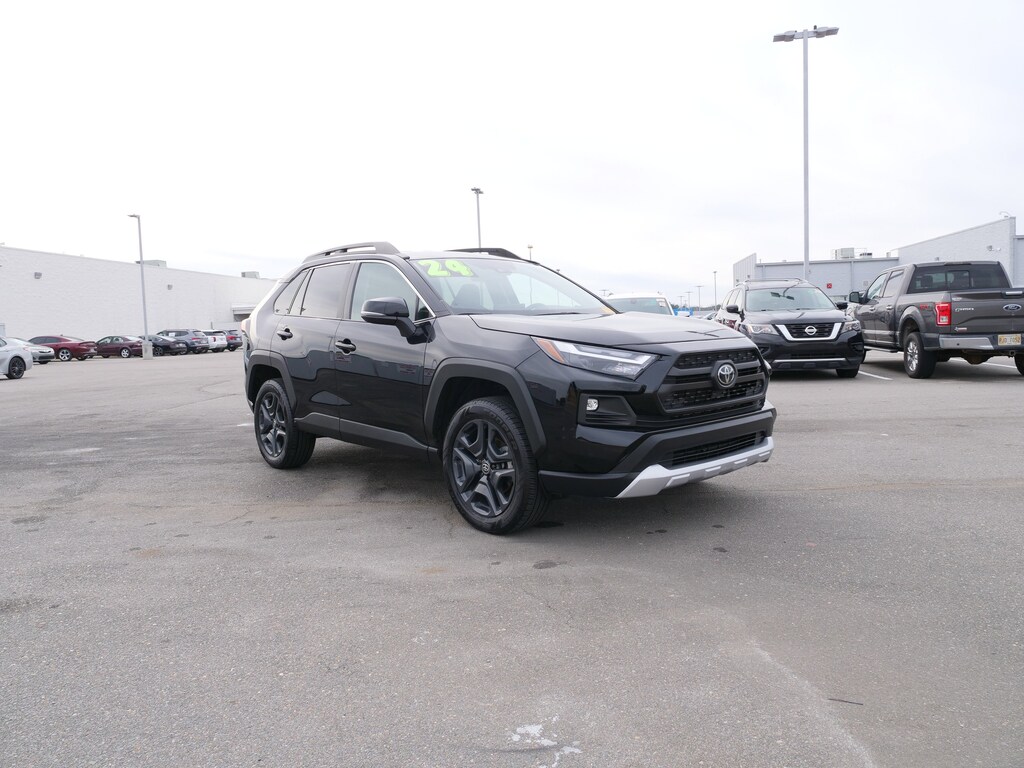 Black 2024 Toyota RAV4 Adventure 2.5L 4-Cylinder DOHC Dual VVT-i 8-Speed Automatic AWD AWD, 19 Split 5-Spoke Alloy Wheels, 4-Wheel Disc Brakes, 6 Speakers, ABS brakes, Air Conditioning, Alloy wheels, AM/FM radio: SiriusXM, Auto High-beam Headlights, Automatic temperature control, Axle Ratio: 3.177, Brake assist, Bumpers: body-color, Delay-off headlights, Driver door bin, Driver vanity mirror, Dual front impact airbags, Dual front side impact airbags, Electronic Stability Control, Emergency communication system: Safety Connect (10-year trial), Exterior Parking Camera Rear, Four wheel independent suspension, Front anti-roll bar, Front Bucket Seats, Front Center Armrest, Front dual zone A/C, Front fog lights, Front reading lights, Fully automatic headlights, Heated door mirrors, Illuminated entry, Knee airbag, Leather Shift Knob, Leather steering wheel, Low tire pressure warning, Occupant sensing airbag, Outside temperature display, Overhead airbag, Overhead console, Panic alarm, Passenger door bin, Passenger vanity mirror, Power door mirrors, Power driver seat, Power steering, Power windows, Radio data system, Radio: AM/FM/XM Audio System, Rear anti-roll bar, Rear seat center armrest, Rear window defroster, Rear window wiper, Remote keyless entry, Security system, SofTex Seat Trim, Speed control, Speed-sensing steering, Split folding rear seat, Spoiler, Steering wheel mounted audio controls, Tachometer, Telescoping steering wheel, Tilt steering wheel, Traction control, Trip computer, Turn signal indicator mirrors, and Variably intermittent wipers.