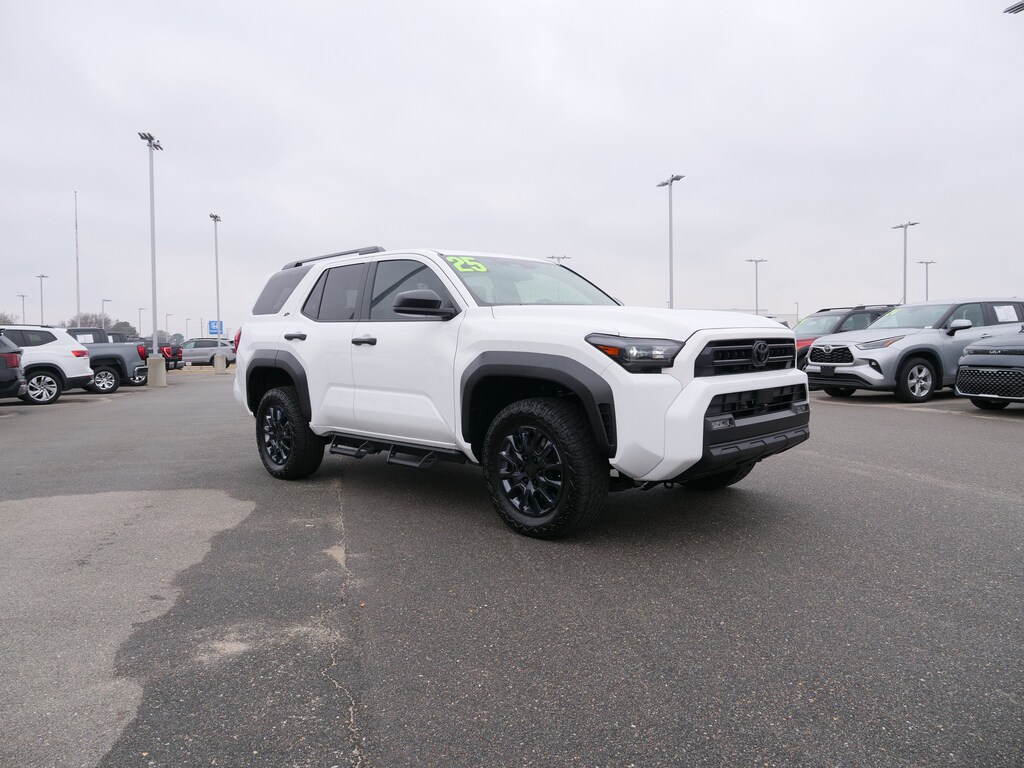 White 2025 Toyota 4Runner SR5 RWD 8-Speed Automatic 2.4L 4-Cylinder Cloth, 4-Wheel Disc Brakes, 8 Speakers, ABS brakes, Air Conditioning, Alloy wheels, AM/FM radio: SiriusXM, Anti-whiplash front head restraints, Apple CarPlay/Android Auto, Auto High-beam Headlights, Automatic temperature control, Brake assist, Bumpers: body-color, Driver door bin, Driver vanity mirror, Dual front impact airbags, Dual front side impact airbags, Electronic Stability Control, Emergency communication system: Safety Connect (1-year trial), Exterior Parking Camera Rear, Fabric Seat Trim (FA), Front anti-roll bar, Front Bucket Seats, Front Center Armrest, Front dual zone A/C, Front fog lights, Front reading lights, Front wheel independent suspension, Heated door mirrors, Illuminated entry, Knee airbag, Leather Shift Knob, Leather steering wheel, Low tire pressure warning, Occupant sensing airbag, Outside temperature display, Overhead airbag, Overhead console, Panic alarm, Passenger door bin, Passenger vanity mirror, Power door mirrors, Power steering, Power windows, Radio: 8" Audio, Rear anti-roll bar, Rear seat center armrest, Rear side impact airbag, Rear window defroster, Rear window wiper, Remote keyless entry, Security system, Speed control, Speed-sensing steering, Split folding rear seat, Spoiler, Steering wheel mounted audio controls, Tachometer, Telescoping steering wheel, Tilt steering wheel, Traction control, Trip computer, Variably intermittent wipers, and Wheels: 17" Dark-Gray Painted Alloy.